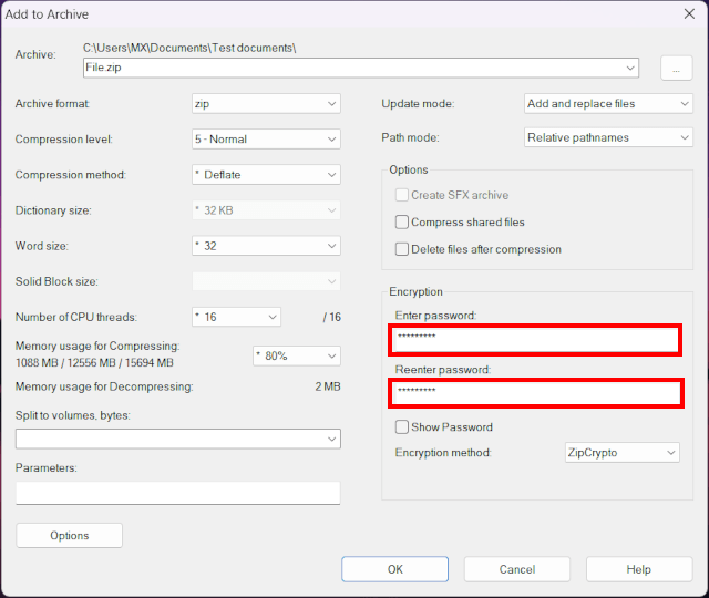 WARNING! You won't be able to open the encrypted ZIP or 7Z file without the password. You should save the password using a password manager or memorize it.