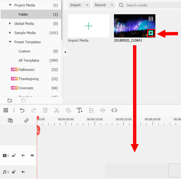 Drag and drop the video to the timeline, or hover your mouse pointer over the video and click on the plus icon.